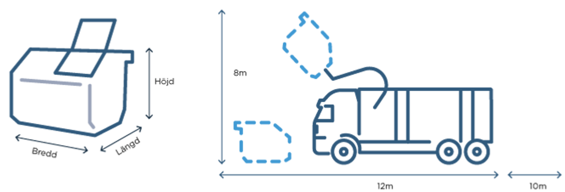 - Fördela vikten jämt i containern – ej tunga massor på ena sidan eller på toppen.